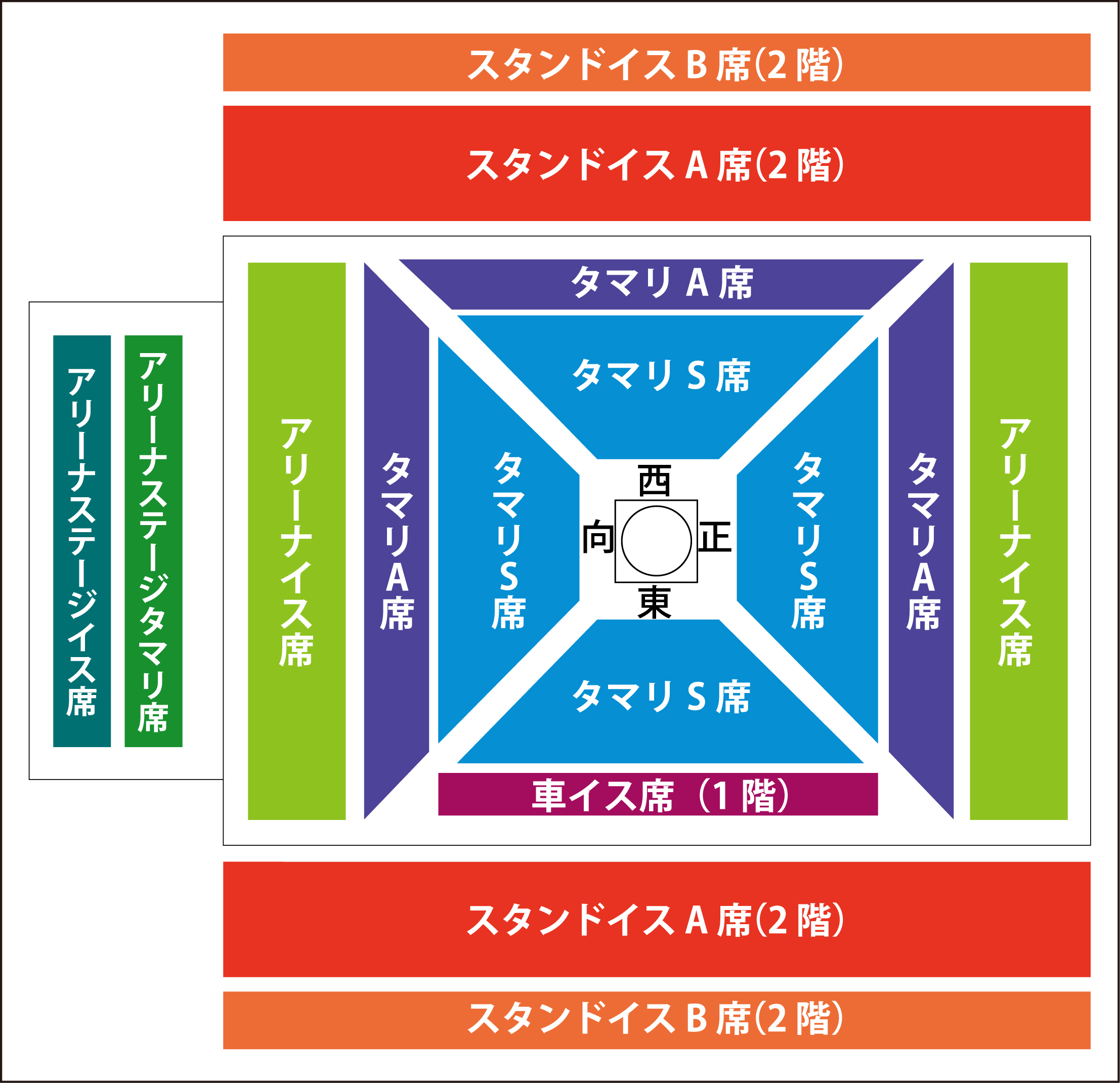 ・スタンド席(2階)のチケットの方角表記に関して、チケットの方角と会場の相撲の方角とは異なる場合がございますので、予めご了承下さい。